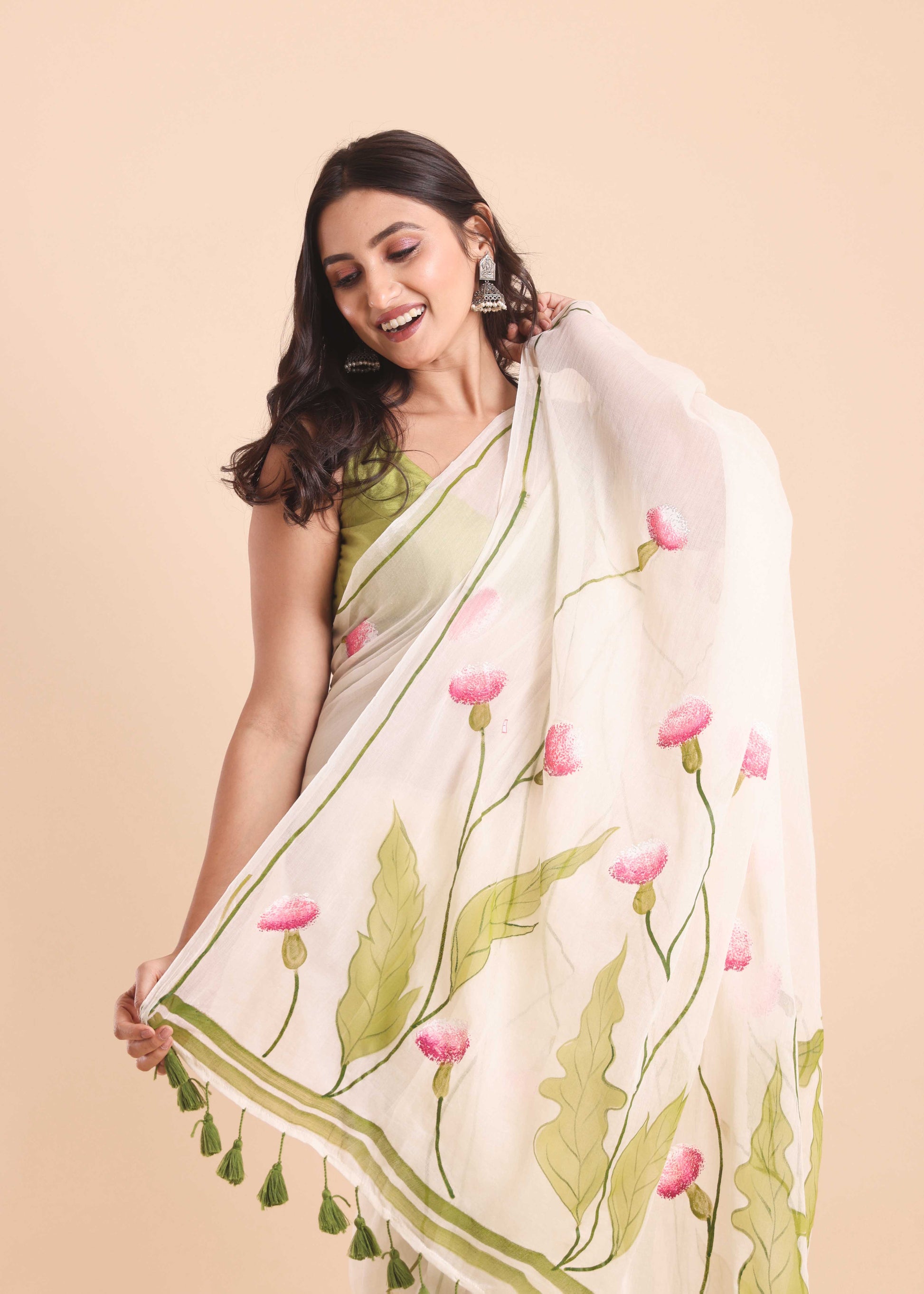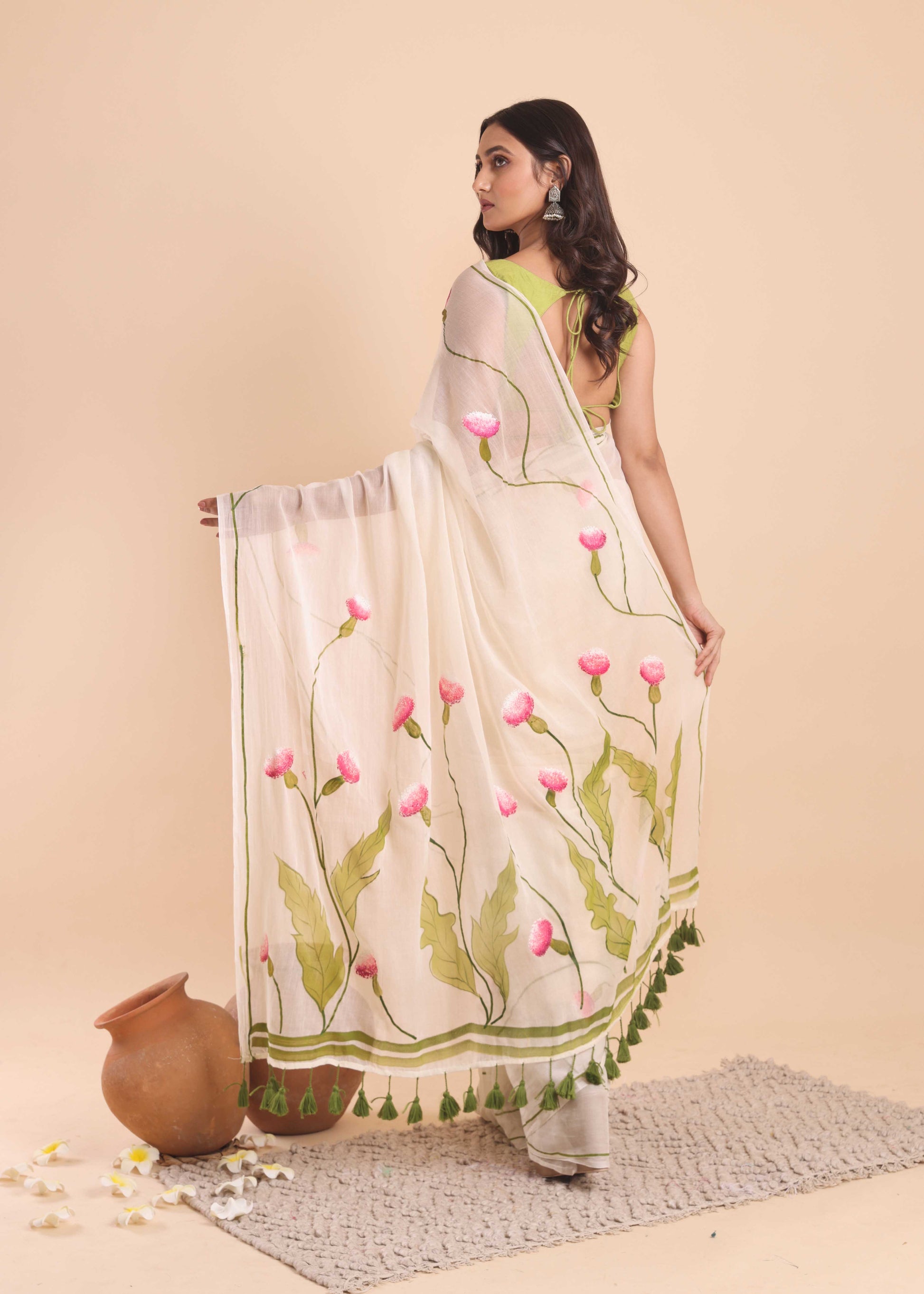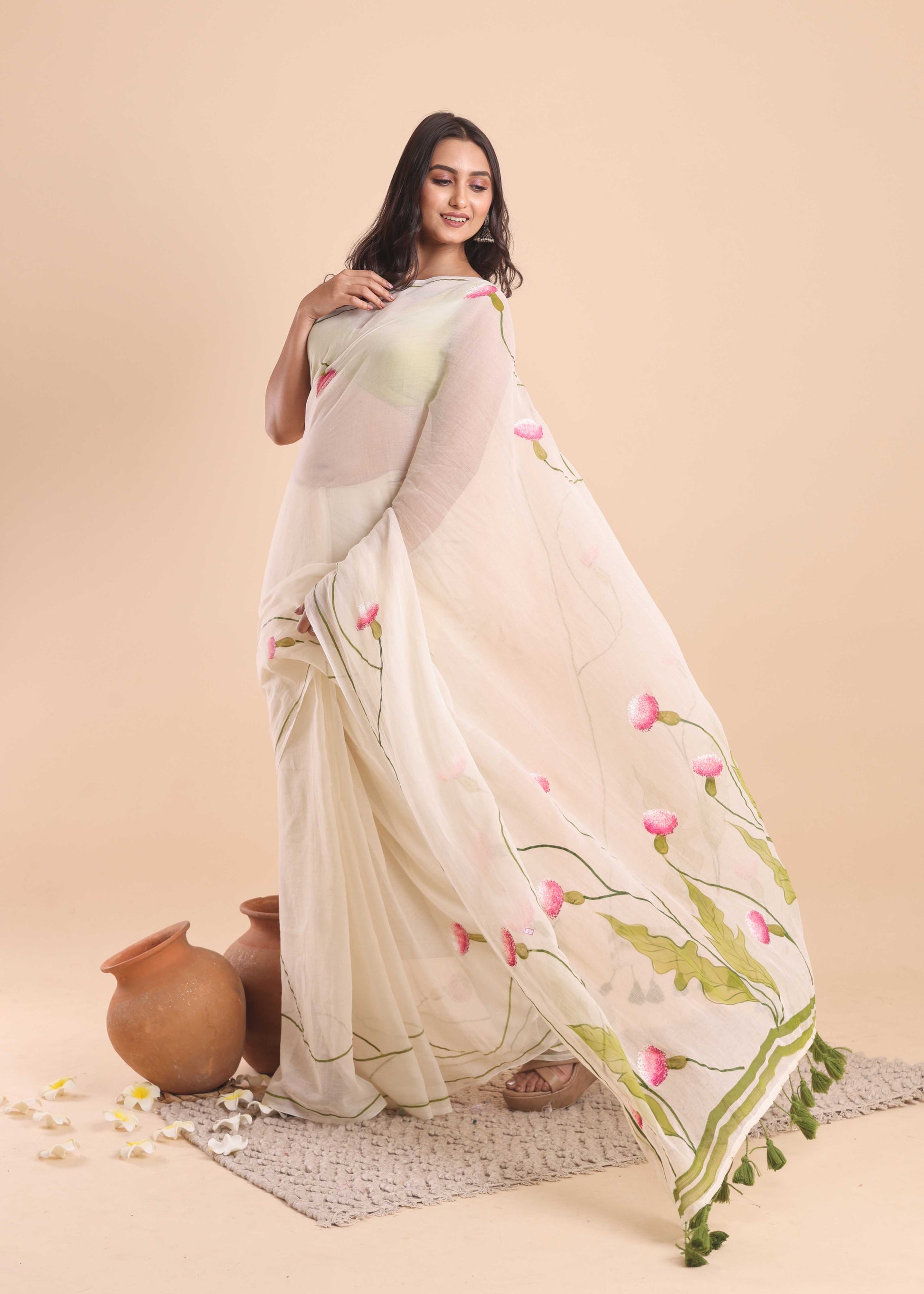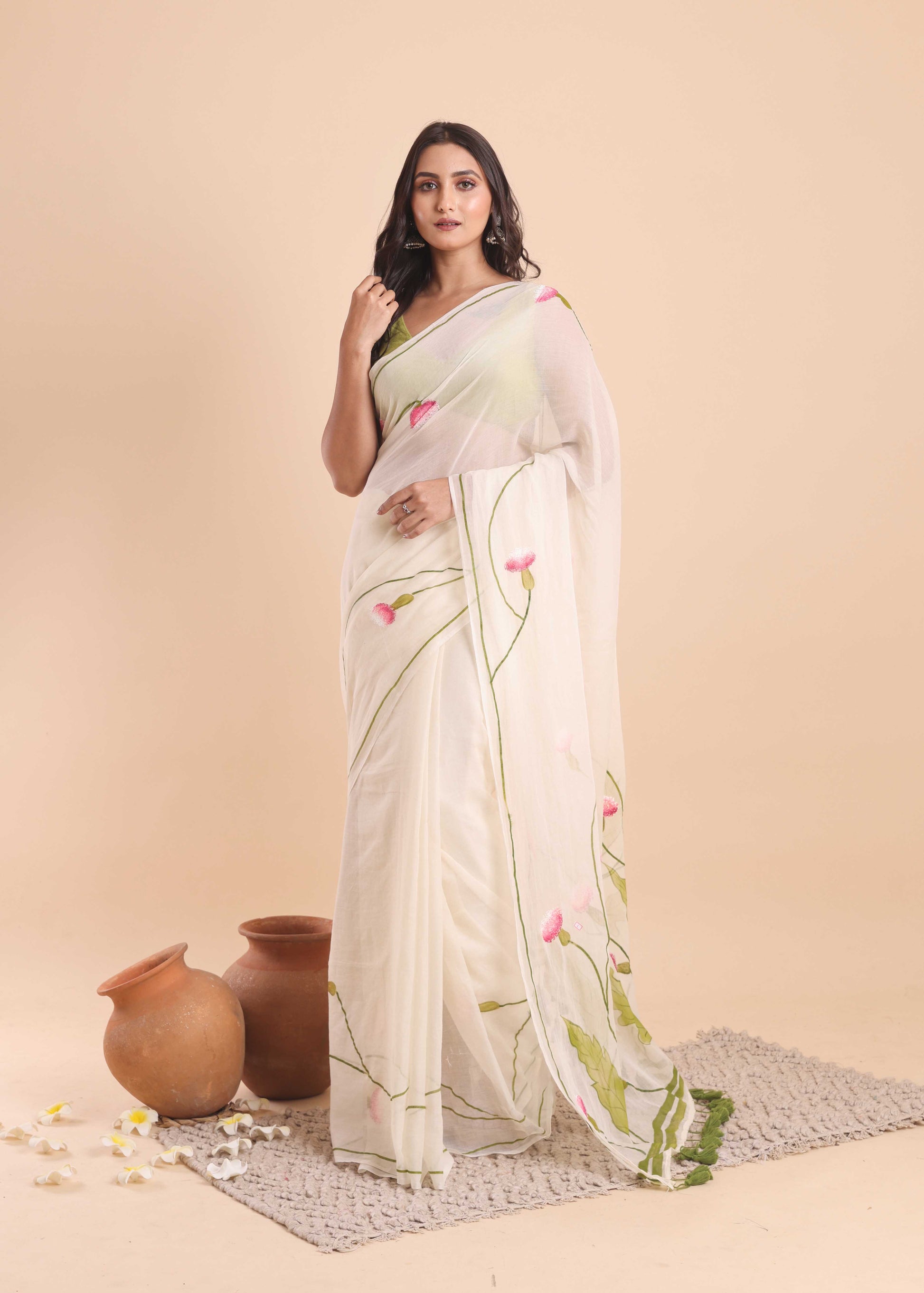 Float through your day in the sheer softness of Shaaj Calcutta’s mulmul cotton saree. Crafted from the softest cotton, this drape is feather-light on the skin and adorned with hand-drawn artistry that speaks of quiet elegance and soul. Perfect for brunches, poetry walks, or simply lounging in style.