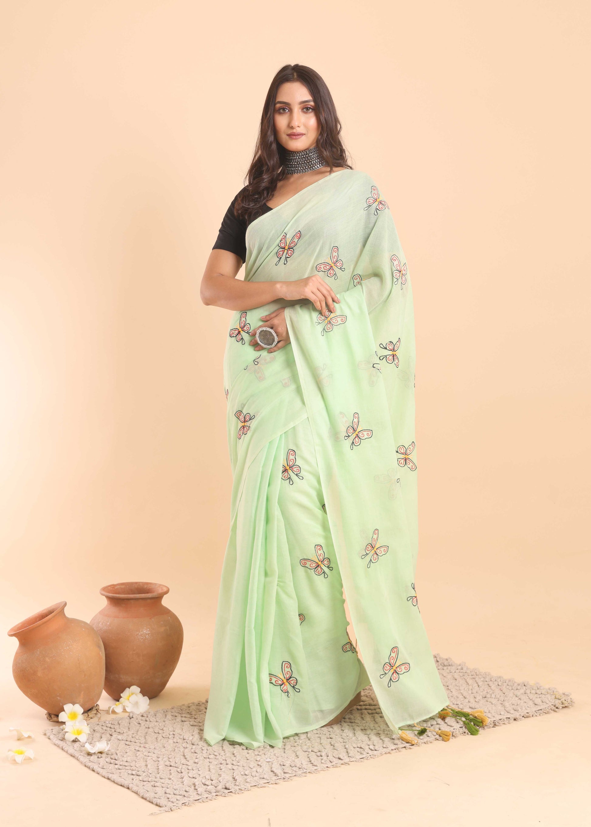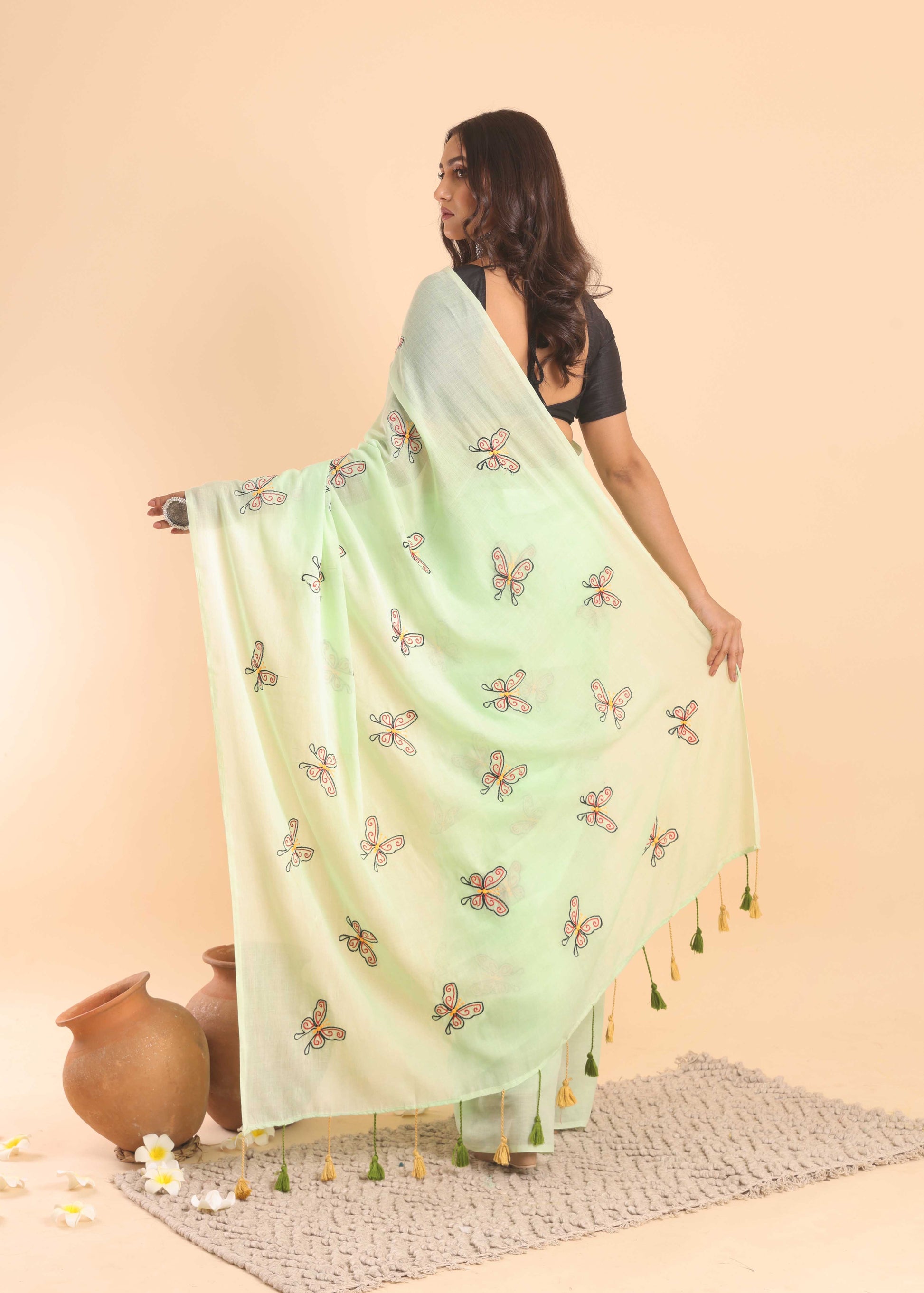 ◾️ DISCLAIMER: The variation of colors may appear slightly different due to lighting conditions during photoshoot. This saree is hand-painted/Embroidered; slight irregularities or brushstroke variations are not defects but rather marks of true craftsmanship.